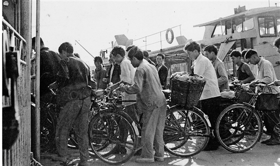 早高峰时,过江的市民推着自行车,排队上渡轮。