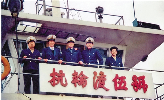 杭州轮渡公司5号渡轮全体船员在船上合影。