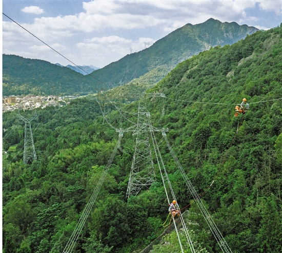 | 9月25日上午,在乐清芙蓉镇东岙村旁崇山峻岭中的上空,只见电力工人乘坐挂在导线上的滑轮车缓缓“飞”向距离铁塔约200米处的输电导线中部,仿佛空中冒险、关山飞渡。这是国网温州供电公司输电线路检修人员正利用“飞车出线”方式,对500千伏都塘5861线的避雷线进行断股修补,为国庆用电提供更加稳定可靠的用电保障。 通讯员 董吉妮 黄周虎 记者 张帆 摄 |