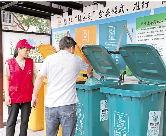 今年3月起,杭州江干区试点招募“桶长”,负责垃圾分类督导、宣传,垃圾分类准确率、投放正确率均实现显著提升。图为江干区闸弄口街道春晖社区的“桶长”引导居民正确分类投放垃圾。 本报记者 姚群 石怡锋 拍友 吴东超 摄