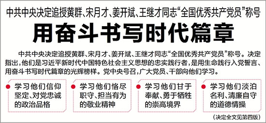 中共中央决定追授黄群、宋月才、姜开斌、王继才同志“全国优秀共产党员”称号