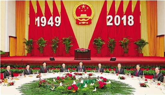 9月30日晚,国务院在北京人民大会堂举行国庆招待会,热烈庆祝中华人民共和国成立六十九周年。习近平、李克强、栗战书、汪洋、王沪宁、赵乐际、韩正、王岐山等党和国家领导人与中外人士欢聚一堂,共庆佳节。 新华社记者 刘卫兵 摄
