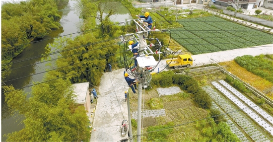 余杭区供电公司员工对仙宅村进行农网改造,确保秋季电网安全稳定运行。张德峰 摄