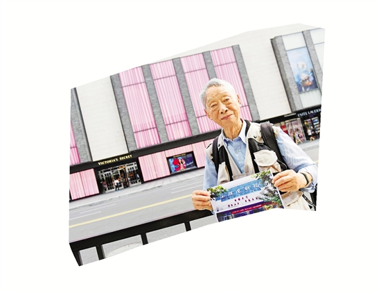 ⑤ 2018年国庆节前夕,刘浩源在西湖电影院旧址前留影。如今这里成了银泰in77商场。