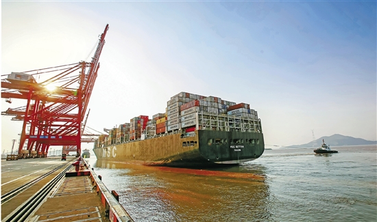 我国全面开放新格局加速形成。图为一艘货轮驶离宁波舟山港穿山港区集装箱码头前往西班牙。 新华社发