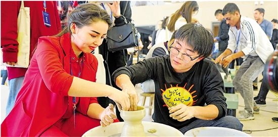 | 近日,“越窑心,海丝情”对外文化交流系列活动在浙江工商职业技术学院和上林湖越窑国家考古遗址公园举行。在为期两天的活动中,浙江工商职院来自乌兹别克斯坦、也门、孟加拉等“一带一路”沿线国家的留学生,通过看展览、听讲座、体验青瓷制作等方式充分感受了中国非物质文化遗产的魅力。图为来自乌兹别克斯坦的留学生Marjona正在体验青瓷拉坯制作工艺。 通讯员 陶钰滢 姚敏明 摄 |
