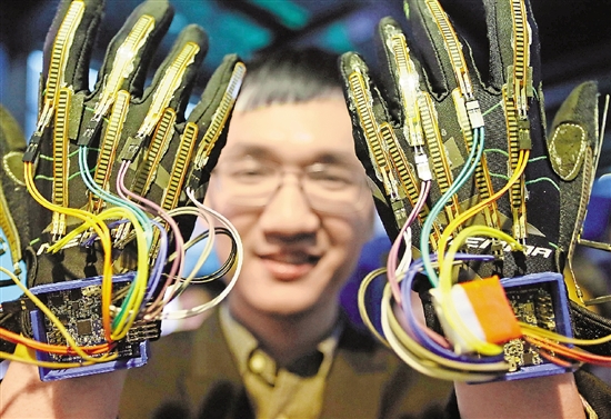 2016年11月,在乌镇第三届世界互联网大会上亮相的科技潮品——聋哑人手语翻译手套。