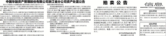 受委托2018年11月14日14时在杭州下城区现代置业大厦东楼908举行拍卖会,拍卖标的:浙江华力工贸有限公司、浙江科华金属制品有限公司2户债权,截至2018年8月31日,账面金额本金4484万元,利息112.03万元(计息暂计算至2017年7月31日)。展示报名:即日起接受咨询,有意者须在2018年11月13日17时前交纳保证金400万元,并凭有效证件等到本司办理参拍手续。下列人员不得购买或变相购买本标的:公务员、金融监管人员、政法干警、资产公司人员、国有企业债务人管理层及参与资产处置等中介机构人员及上述人员关联人等。上述人员如购买或变相购买本标的,后果自负。电话:(0571)85817253、13136107727黄女士。