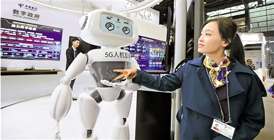 | 11月6日上午,第五届世界互联网大会“互联网之光”博览会在乌镇拉开帷幕。可以随意折叠的柔性电子书、只需语音操控的无人车、输入文字就能智能播报的虚拟AI主播……展会现场多款生动有趣的黑科技产品引来了众多观众围观体验。图为电信展台基于智能识别和5G技术的智能机器人和工作人员比赛。 本报记者 倪雁强 张孙超 摄 |