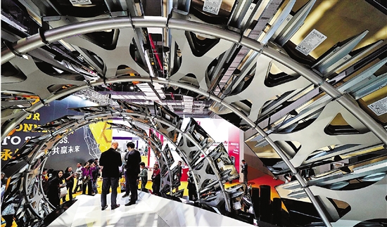 11月10日,参观者在进博会智能及高端装备展区参观德国AVANCIS公司展出的可用作幕墙的发电玻璃。 新华社记者 陈飞 摄