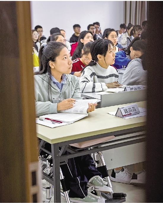 2018年11月2日,苗苗坐在轮椅上与同学们一起上课。
