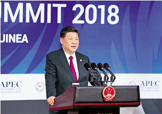 11月17日,国家主席习近平应邀出席在巴布亚新几内亚莫尔兹比港举行的亚太经合组织工商领导人峰会并发表题为《同舟共济创造美好未来》的主旨演讲。 新华社记者 鞠鹏 摄