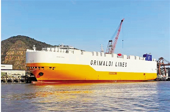 | 11月28日,扬帆集团承建的7800PCTC(汽车滚装船)首制船,在舟山市普陀区顺利交付船东,这是我省制造的首艘7800汽车滚装船,在国际同类船型中处于领先水平。这种船型总长199.9米,型宽36.45米,12层甲板总面积达6.2万平方米,实际可装载7800辆轿车。 |