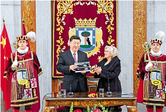 当地时间11月28日,国家主席习近平在马德里市政厅接受马德里城市金钥匙。 新华社记者 饶爱民 摄
