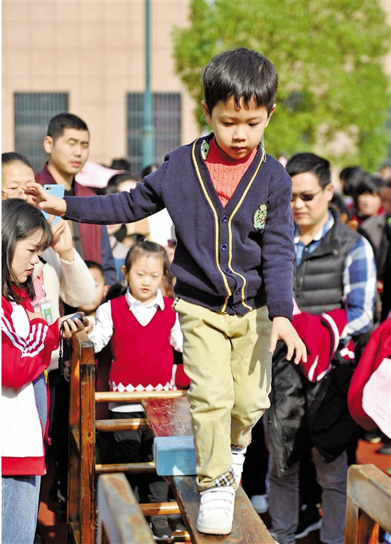 2018年11月30日,七彩桥幼儿园召开运动会,一名有听力障碍的小朋友与小伙伴一起参加平衡木比赛。