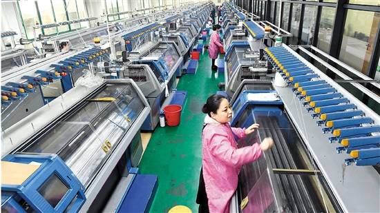 12月19日,杭州市桐庐县金利针织有限公司现代化车间内,员工正在生产出口产品。近年来,该企业全面转型升级,引进60多台德国先进电脑横机,产品向中高档的羊绒、羊毛以及混纺产品转变。今年截至11月底,公司出口欧洲、美国等地区和国家的销售额达1.6亿元,同比增长15%。 本报记者 吴元峰 摄 |