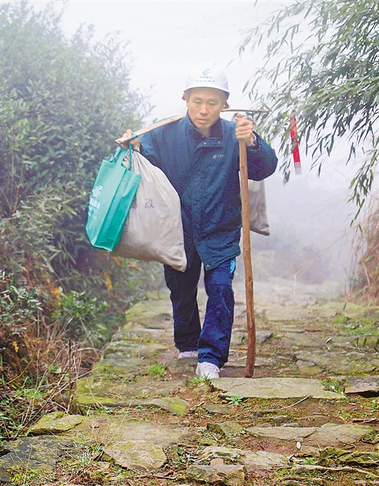 一遇到雨雪天气,邮车上不了山,黄建桥就挑着担子,徒步上山投递。
