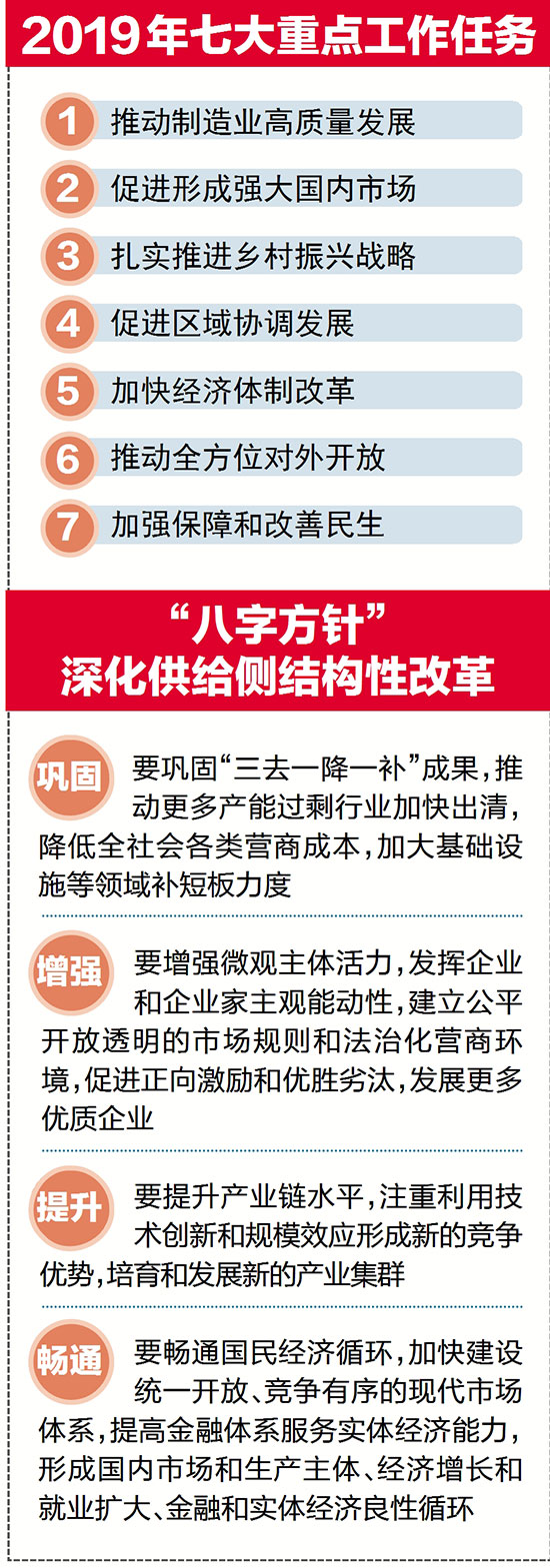 要巩固“三去一降一补”成果,推动更多产能过剩行业加快出清,降低全社会各类营商成本,加大基础设施等领域补短板力度