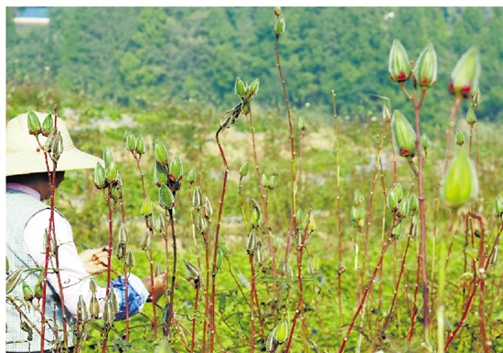 南部县中药材种植基地,图为农民正在采摘黄葵。