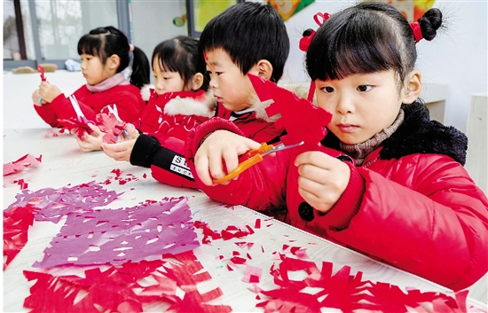 12月28日,长兴县煤山镇白岘中心幼儿园开展“非遗进校园 快乐迎新年”活动,让孩子们感受新年的喜庆氛围。 拍友 许斌华 谭云俸 摄