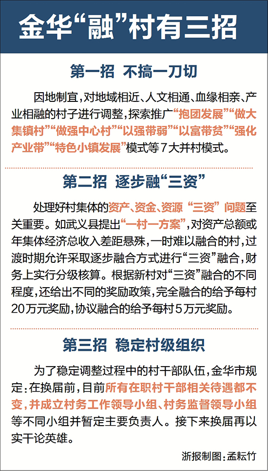 为了稳定调整过程中的村干部队伍,金华市规定:在换届前,目前所有在职村干部相关待遇都不变,并成立村务工作领导小组、村务监督领导小组等不同小组并暂定主要负责人。接下来换届再以实干论英雄。