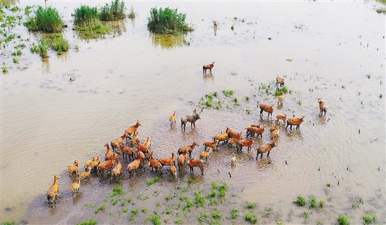 | 一群自然野化的麋鹿在湖南东洞庭国家级自然保护区内活动(2017年5月10日无人机拍摄)。麋鹿是我国特有物种、世界珍稀动物,曾一度在中国消失。如今,在洞庭湖湿地深处,在青草露珠之间,麋鹿种群不断繁衍壮大。 新华社记者 李尕 摄 |
