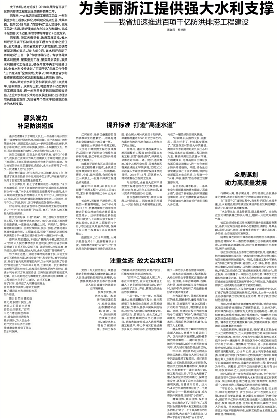 当前,面对治水新任务和新要求,浙江多措并举、创新实践。从实际出发,调整百项千亿防洪排涝工程项目库,进一步完善补齐防洪排涝短板措施,让重大水利建设成为惠及民生福祉、拉动经济增长的重要支撑,为我省两个高水平建设筑起强大的水利支撑。