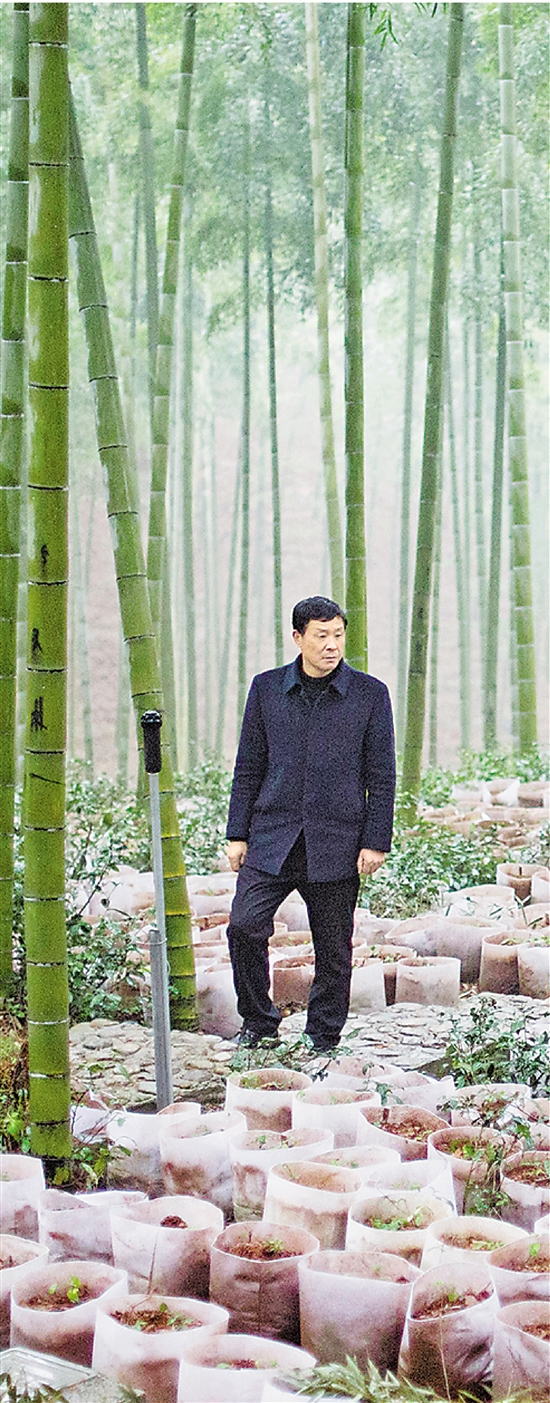 鲍新民在查看林下的中草药作物。 记者 倪雁强 摄
