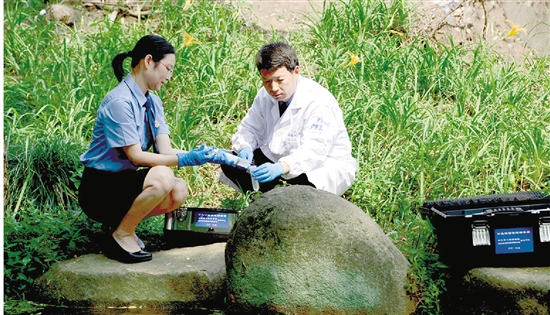 检察官使用我省独家开发的公益诉讼现场取证勘查箱进行现场取证。