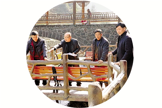 村内的河道有些坑洼,程义法(左二)和其他村干部正计划平整河床。