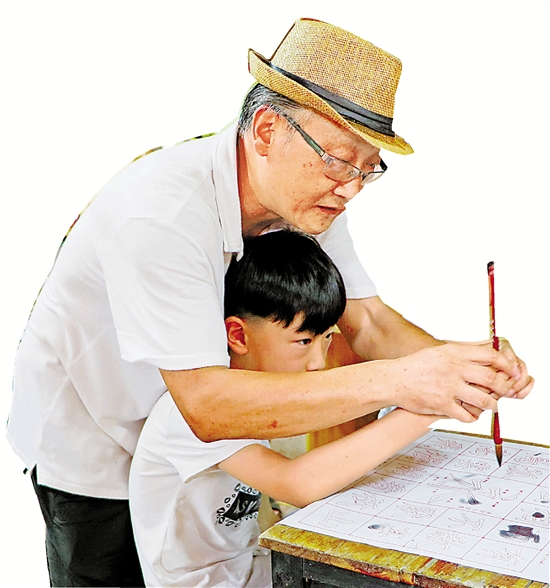 暑假,丰盈坦“诗礼之家”吸引了一批批城里的孩子,程义法手把手教他们写毛笔字。