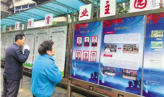 图为红梅新村小区的居民在查看公告栏里的“执法清单”。