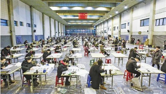 书法学与教育专业考场设在中国美院象山校区体育馆内,上千考生同场挥毫泼墨,场面壮观。