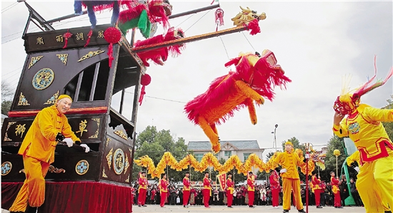 | 下图:3月8日,在诸暨应店街镇十二都村,1000余人参加了南孟祭礼仪式、非遗踩街、非遗集市等文化活动。来自衢州的南孔后裔与南孟后裔首次相聚诸暨,共同研讨“南孟”文化,完成了一次跨越近千年的第一次握手。图为“草塔抖狮”表演。 |