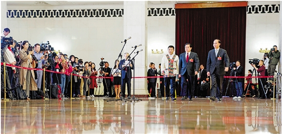 3月8日,全国人大代表马正山、范照兵、姒健敏(从左至右)步入“代表通道”,准备接受采访。 新华社记者 刘金海 摄