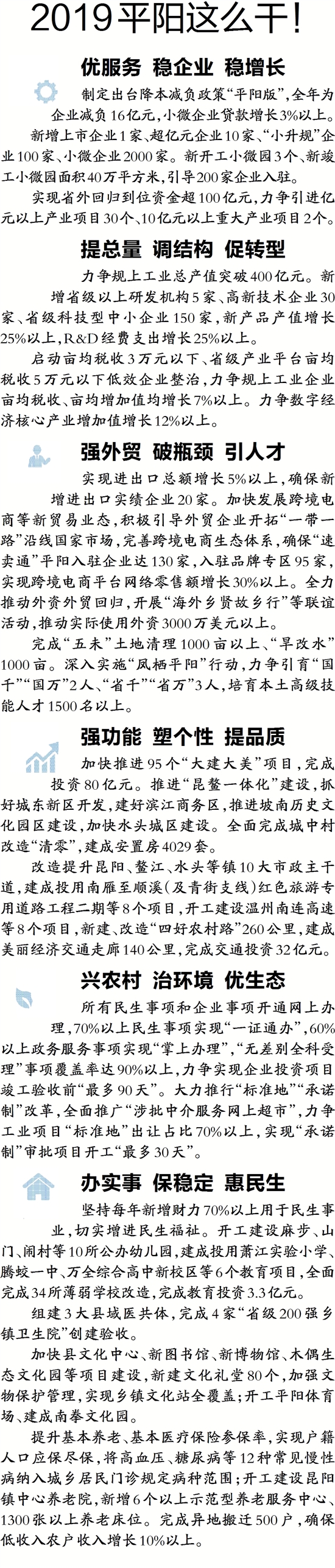 制定出台降本减负政策“平阳版”,全年为企业减负16亿元,小微企业贷款增长3%以上。