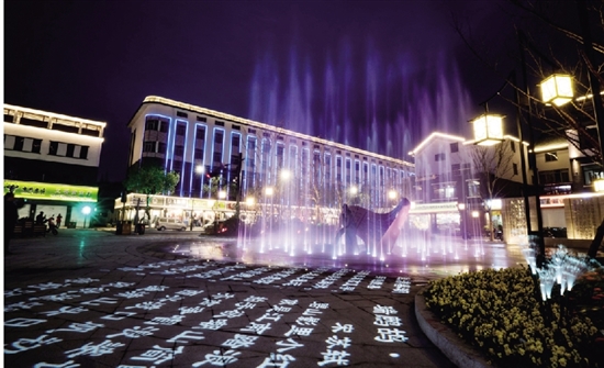 义桥镇结合唐诗文化,打造了诗词公园,园内有陆游雕塑,诗词碑等景点,灯光投影下的经典诗词,让市民们流连忘返。