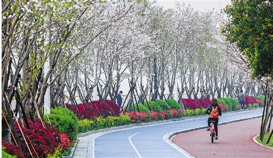 杭州滨江区钱塘江边的最美跑道樱花盛开,美不胜收(本报资料照片)。