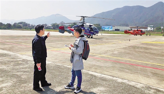 邢建武(左)向记者介绍K-32直升机。 本版图片均由省航管站提供