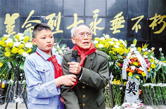 4月3日,长兴古城公园革命烈士纪念碑前,90岁的老战士刘玉玺正在给学生讲革命故事。