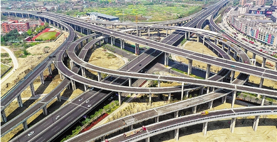 | 4月8日,空中俯瞰杭州秋石高架路与望梅路交汇的小林互通,在建的最后两条匝道已浇筑完毕,开通在即。这是杭州余杭区“三路一环”工程的重要节点工程。“三路一环”工程总投资约108.7亿元,全线通车后,将大大缩短临平与杭州市中心之间的车程。 本报记者 董旭明 摄 |