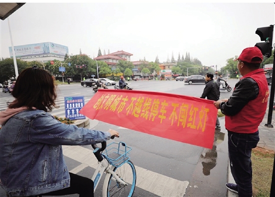 志愿者在衢州市三衢路与荷花中路路口执勤,交通秩序井然
