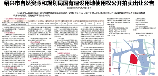 经绍兴市人民政府批准,绍兴市自然资源和规划局决定于2019年5月22日上午9时,以网上拍卖方式公开出让越城区大树江4号地块国有建设用地使用权。现将有关事项公告如下: