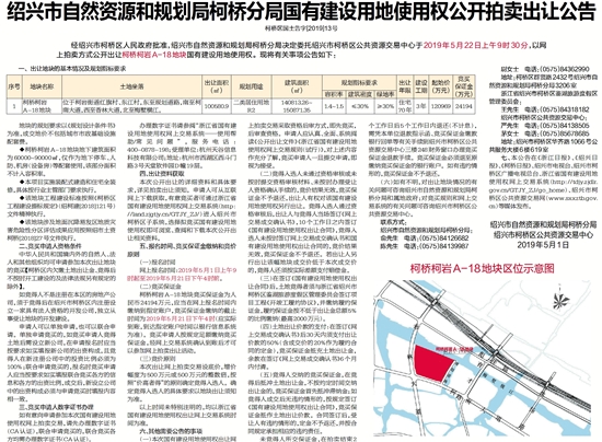 经绍兴市柯桥区人民政府批准,绍兴市自然资源和规划局柯桥分局决定委托绍兴市柯桥区公共资源交易中心于2019年5月22日上午9时30分,以网上拍卖方式公开出让柯桥柯岩A-18地块国有建设用地使用权。现将有关事项公告如下: