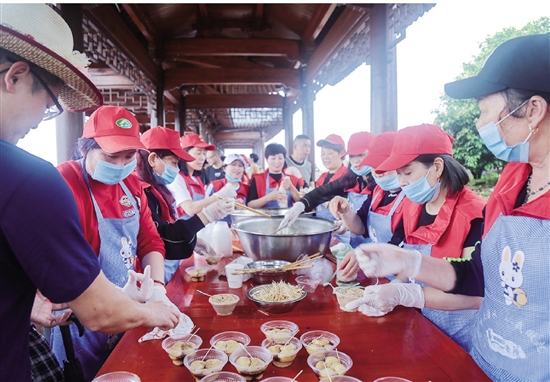 在杜鹃花节上,峃前村新组建的红船志愿者队队员为游客制作发放免费食品。 刘言勇 摄