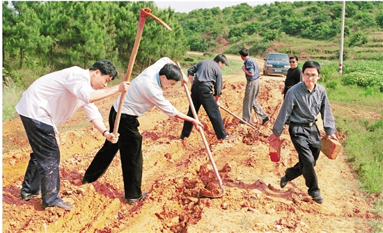 2001年5月,浙报集团纪念建党80周年“光辉的足迹”采访报道团在前往井冈山途中路遇水毁道路,记者俞文明(左三)、金波(左一)、张雪南(左二)、王国锋(右一)下车挥锄修路。 记者 潘海松 摄