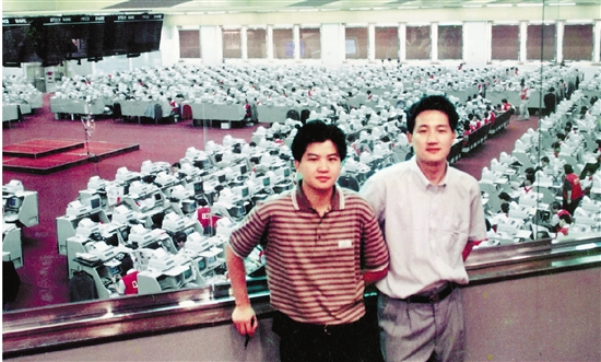 香港回归前夕,浙江日报组织采访团赴香港采访,记者周天晓(右)与程为民(左)在香港证券交易所。 记者 张环清 摄
