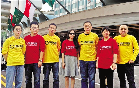2015年11月6日,浙报集团特派记者(左起:王曦煜、童俊、毛传来、何黎、沈建波、任琦、徐斌)到新加坡采访习马会。次日下午,习近平、马英九在新加坡香格里拉大酒店会面。