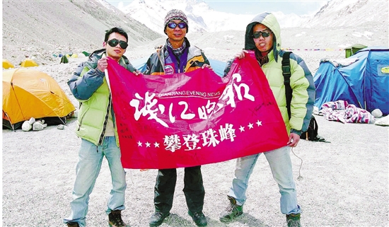 2006年5月14日,庆祝钱江晚报创刊20周年系列活动之一攀登珠峰,登山队员陈思齐(中)将这面旗送上世界第一高峰。钱江晚报记者董旭明(右)、董碧辉(左)跟随登山队员记录了这一时刻。