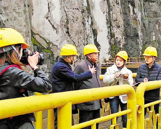 2019年3月23日,浙报集团衢州分社记者肖国强(右一)、钱洁瑗(左一)、赵璐洁(右二)在乌溪江水电厂采访当年的老建设者,听他们讲述老水电人的故事。 周萍 摄